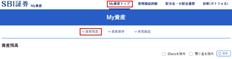 - 1. 「My資産トップ」をクリックし、「資産残高」をクリックする
