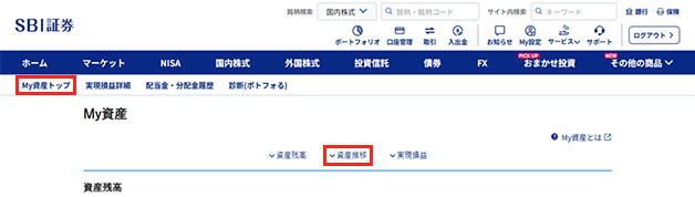 - 1. 「My資産トップ」をクリックし、「資産推移」をクリックする
