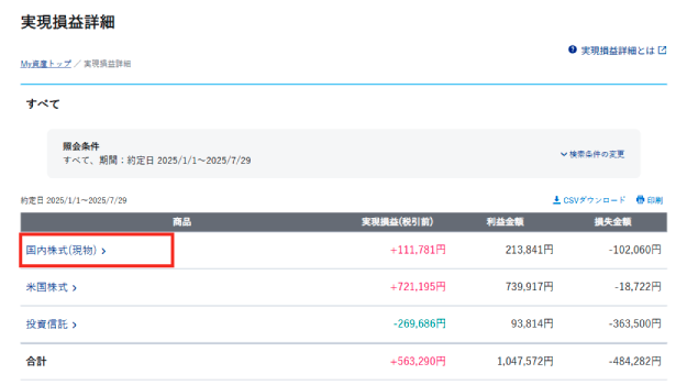 - 実現損益の明細の一覧をCSV形式でダウンロードできます。手順3の画面で、「CSVダウンロード」をクリックします。前日の約定分まで、ダウンロード可能です。