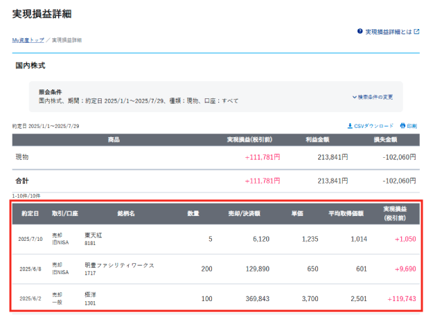 実現損益 (税引前) 「売却額-(平均取得価額×数量)」の値が表示されます。 - 平均取得価額が0円の銘柄は、売却額が実現損益として表示されます。