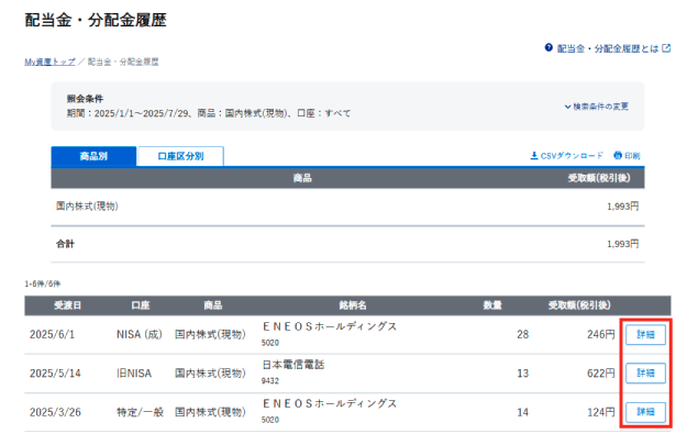 国内株式の保有により交付された配当金の詳細情報を確認します。