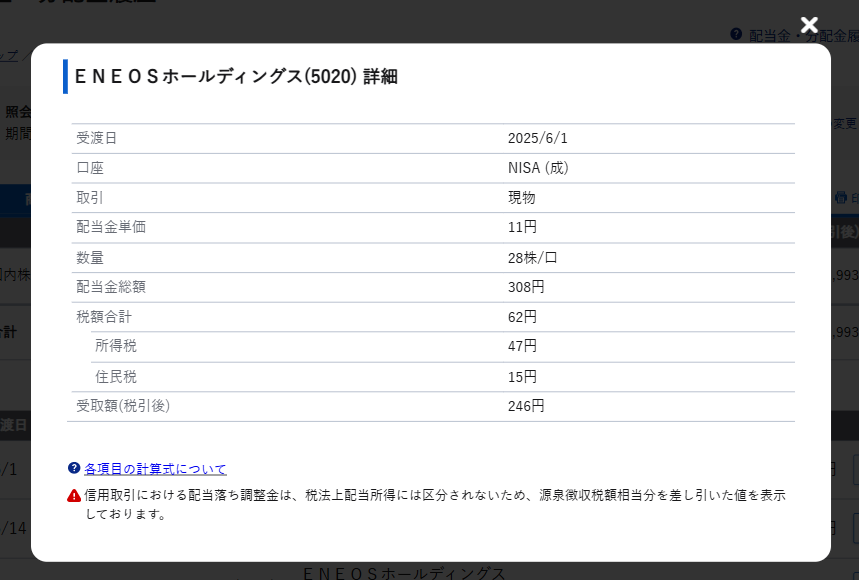 受取額(税引後) 「配当金総額-所得税-住民税」の値が表示されます。 - 資本剰余金は、税法上配当所得には区分されないため、資本剰余金を原資とする剰余金の配当については税金を考慮していません。詳細は、「資本剰余金を原資とする配当のお取扱について」を参照してください。