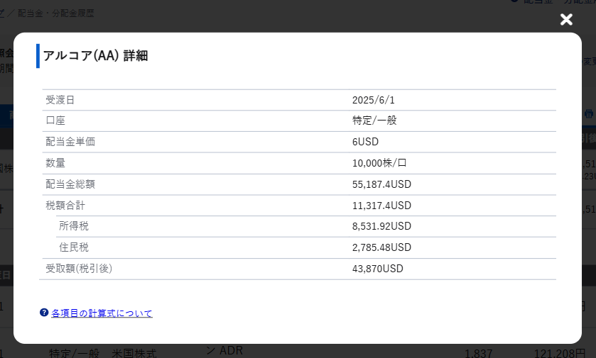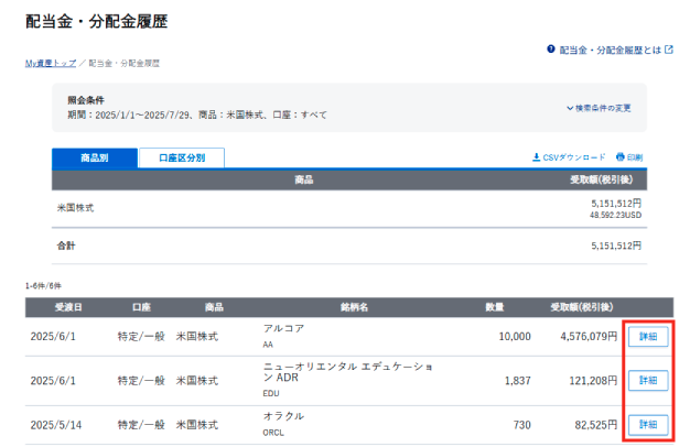 米国株式の保有により交付された配当金の詳細情報を確認します。