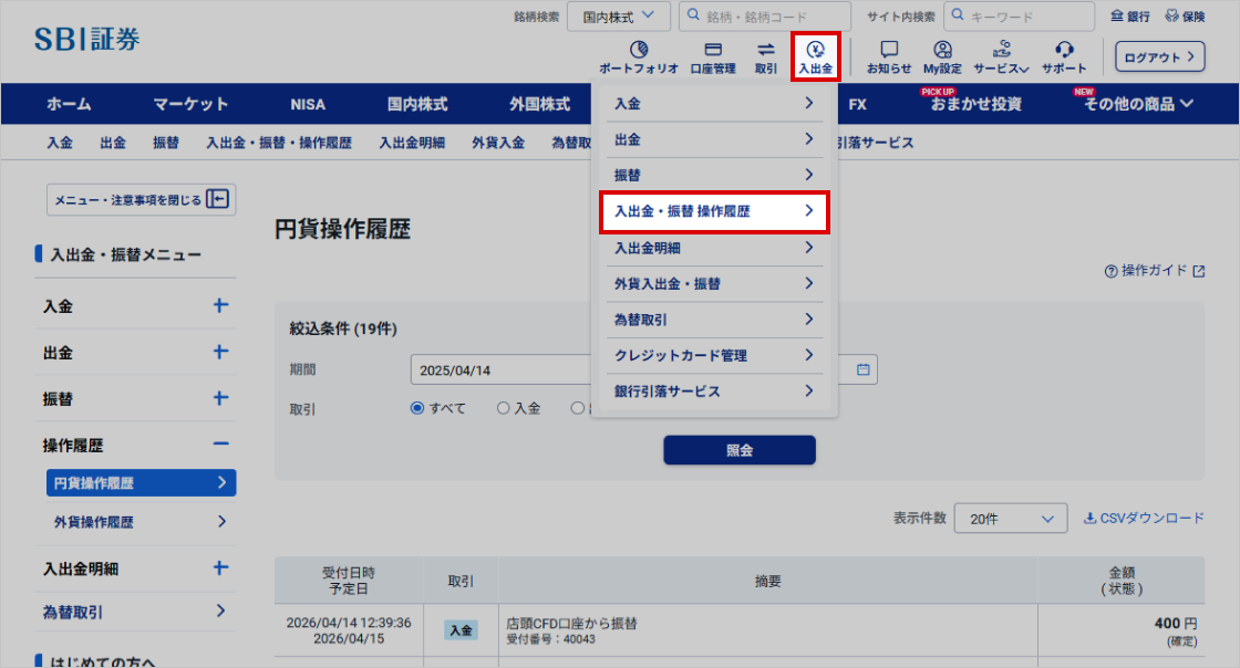 SBI証券のWEBサイト上で行った入出金の操作履歴を確認できます。
