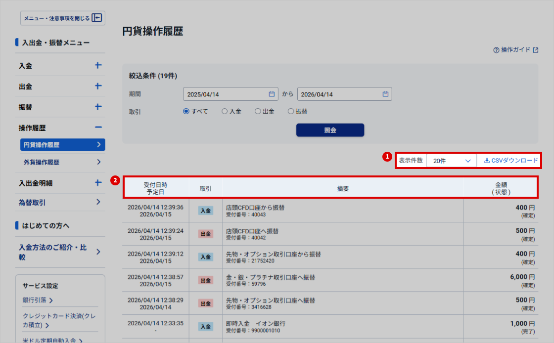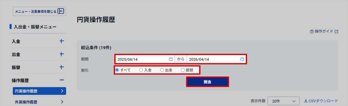 | CSVダウンロード | 円貨操作履歴はCSV形式のファイルでダウンロードできます。「CSVダウンロード」をクリックし、保存先を指定します。 | |