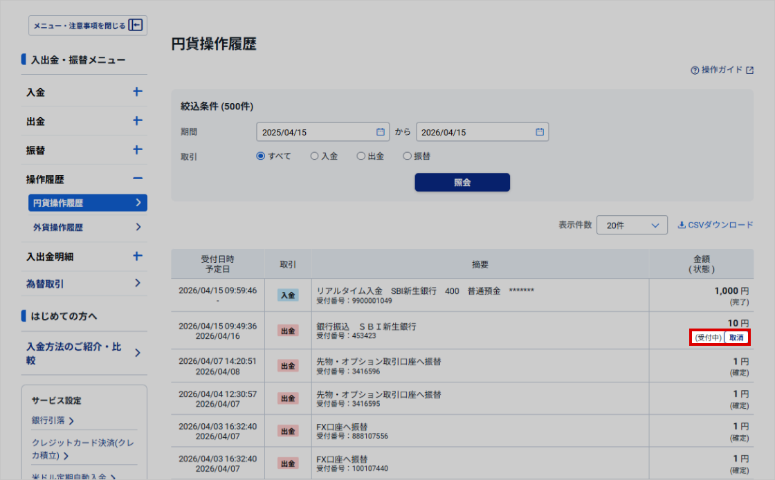 | 出金 | 受付中 | 出金指示受付後、当社における出金処理が開始されるまで表示されます。受付中は、当該指示の取消が可能です。 |