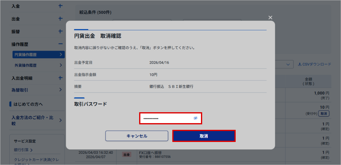 - 2. 内容を確認し、取引パスワードを入力して「取消」ボタンをクリックする