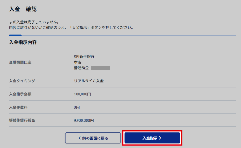 - 4. 入金指示内容を確認し、「入金指示」ボタンをクリックする