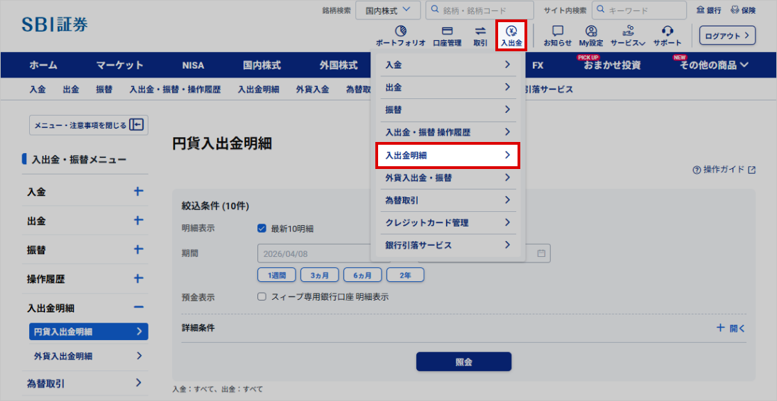 SBI証券のWEBサイトで行った過去2年間の入出金明細を確認できます。