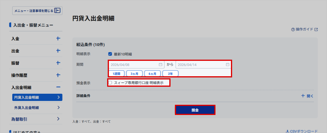 入出金明細が検索条件で絞り込まれます。