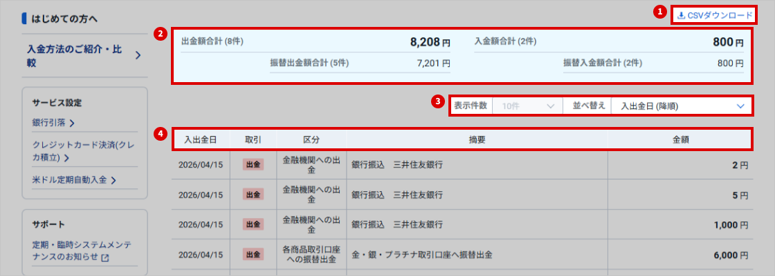 | ① | CSVダウンロード | 入出金明細はCSV形式のファイルでダウンロードできます。「CSVダウンロード」をクリックし、保存先を指定します。 |