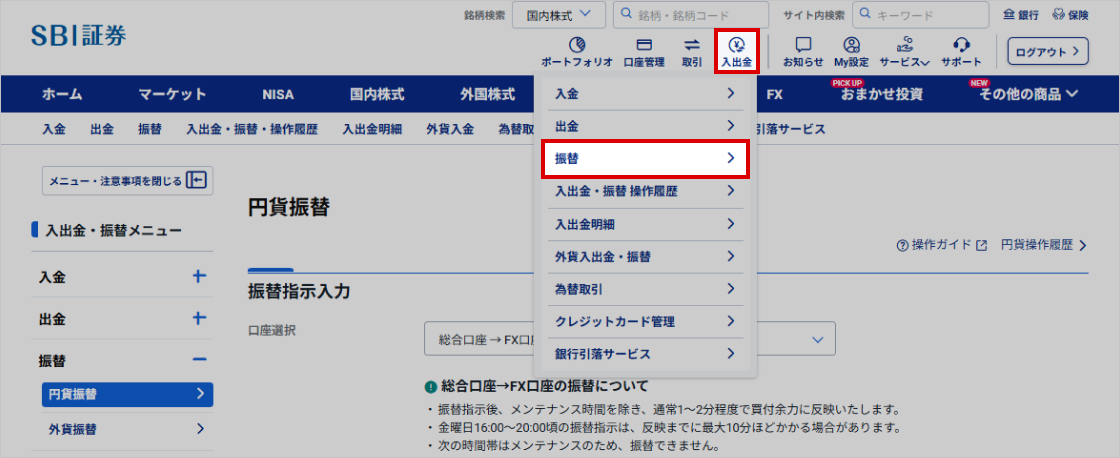 - システムメンテナンス時(原則、毎営業日の16:15~16:45頃)の間は、振替指示を行うことができませんので、あらかじめご了承ください。