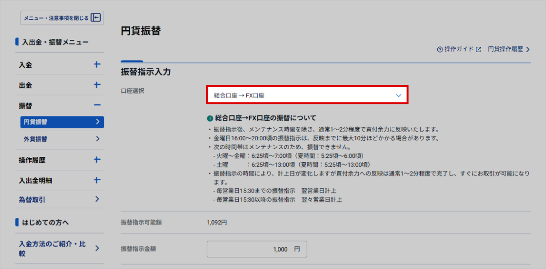 <証券総合口座からFX取引口座への振替>