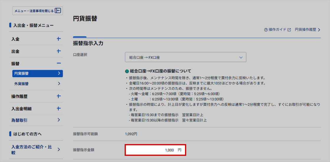 FX取引口座へ振替する