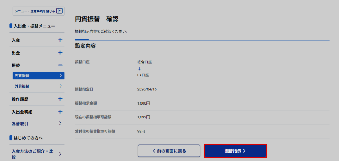 - 5. 振替指示内容を確認し、「振替指示」をクリックする