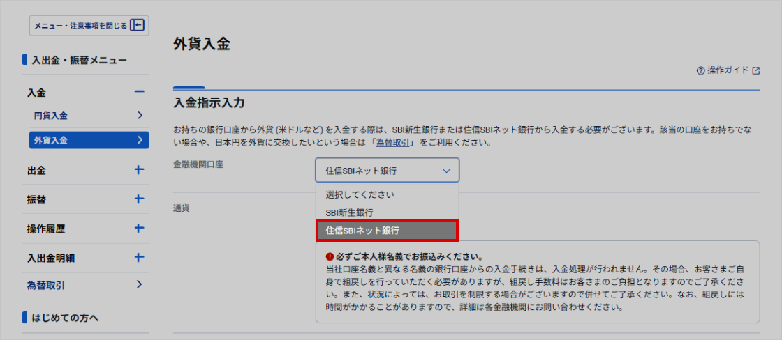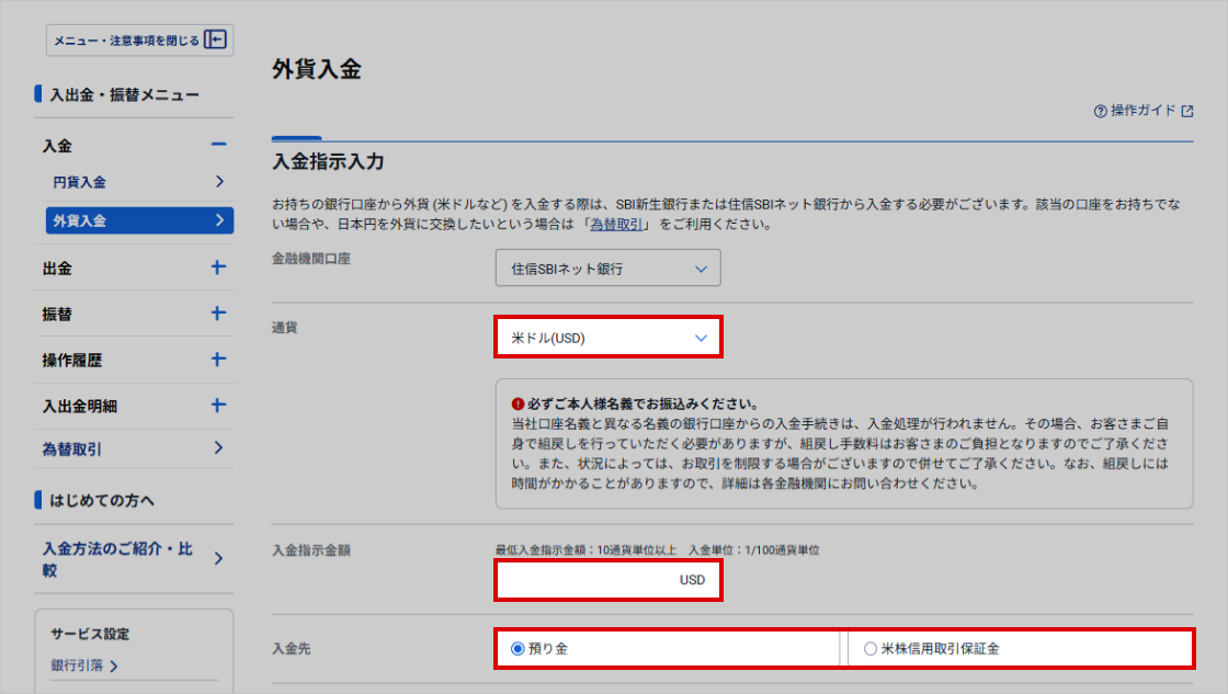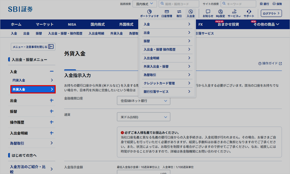 - 外貨即時入金で入金するには、住信SBIネット銀行とのインターネットバンキングの契約が必要です。