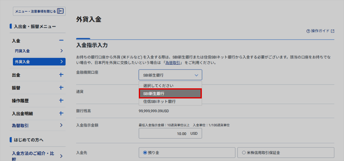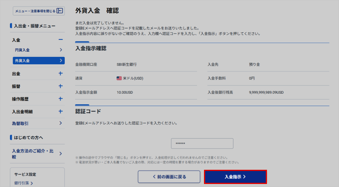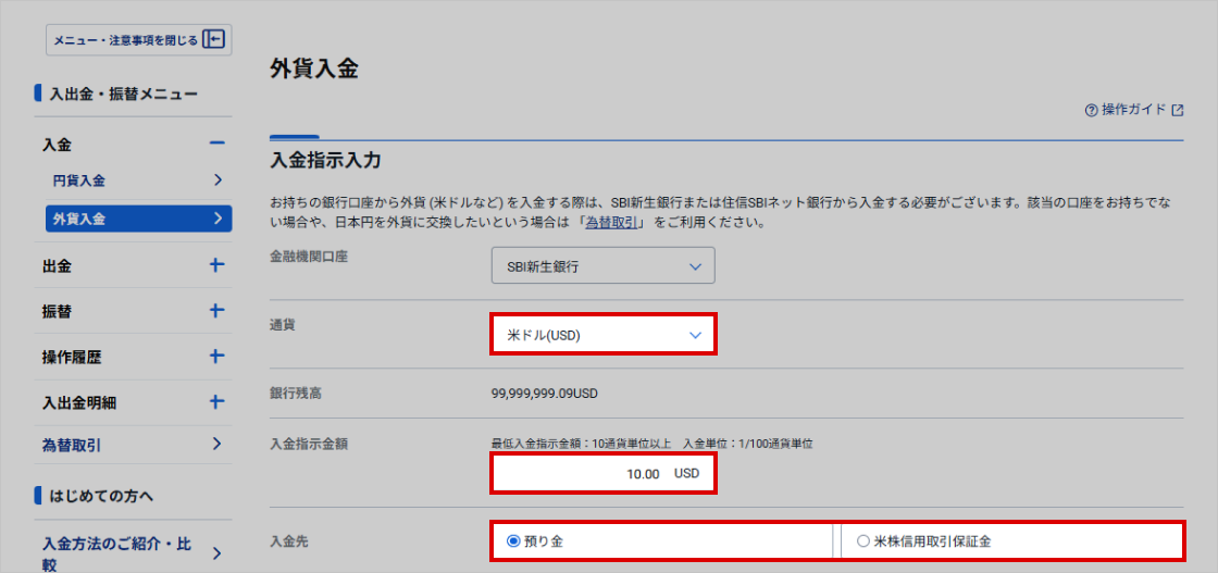 「外貨入金」画面が表示されます。