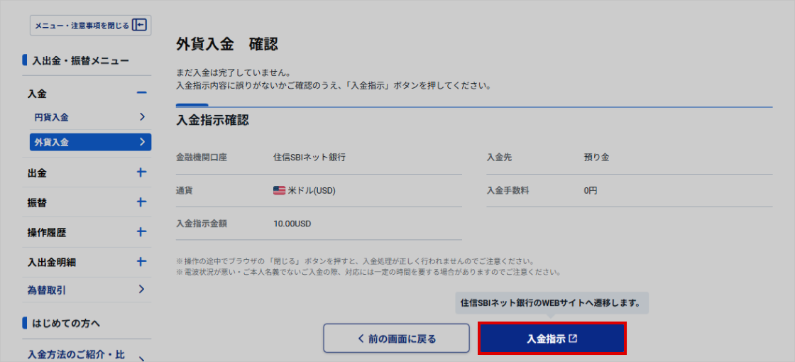 - 7. 入金指示内容を確認し、「入金指示」ボタンをクリックする
