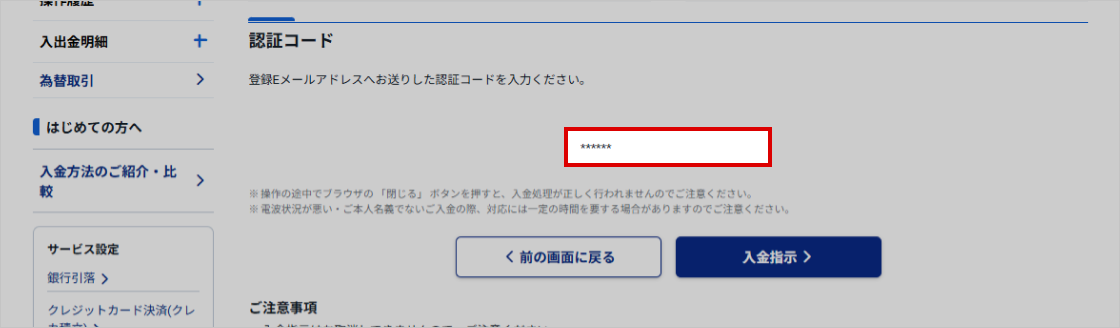 - 一度「入金指示」を実行されますと取消はできませんのでご注意ください。