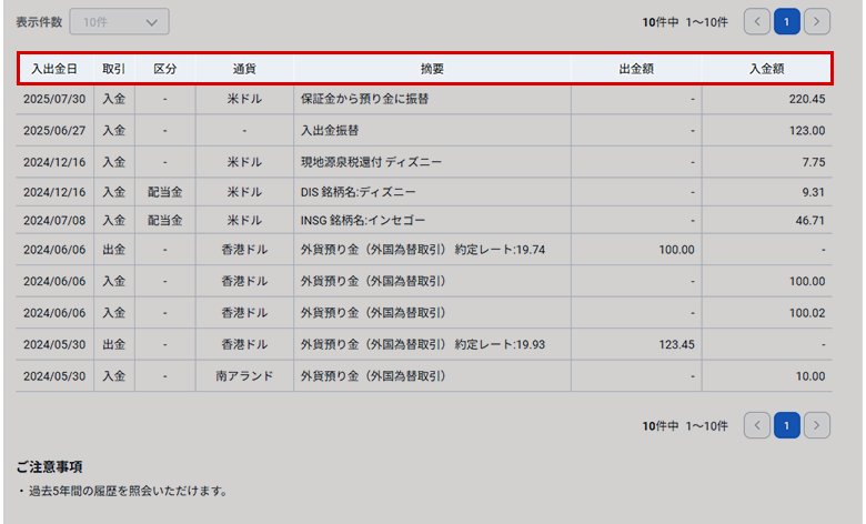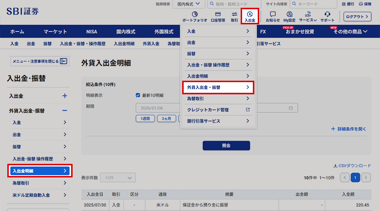 SBI証券のWEBサイトで行った過去5年間の外貨の入出金明細を確認できます。