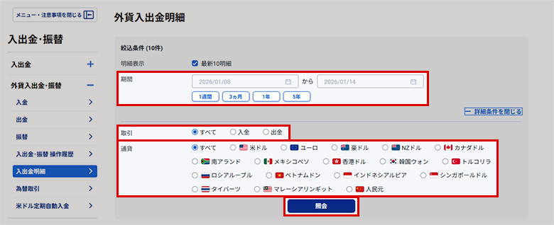外貨入出金・振替 明細を確認する