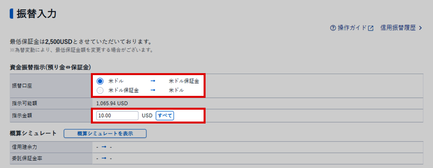 米国株式信用取引口座へ入金するには、<証券総合口座(円)から外国証券取引口座の預り金(米ドル)への為替取引>後に<預り金(米ドル)から保証金への振替>を行う必要がございます。