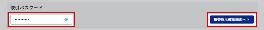 振替指示金額を入力後、「結果を表示」ボタンを押下すると、信用建余力欄にて指示後の信用建余力を確認いただけます。18時~19時は、値洗い処理中のため、指示前後の信用建余力は同じ値が表示されます。 - 4. 取引パスワードを入力し、「振替指示確認」ボタンをクリックする