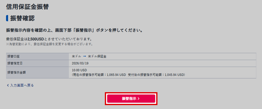 - 5. 内容を確認し、「振替指示」ボタンをクリックする