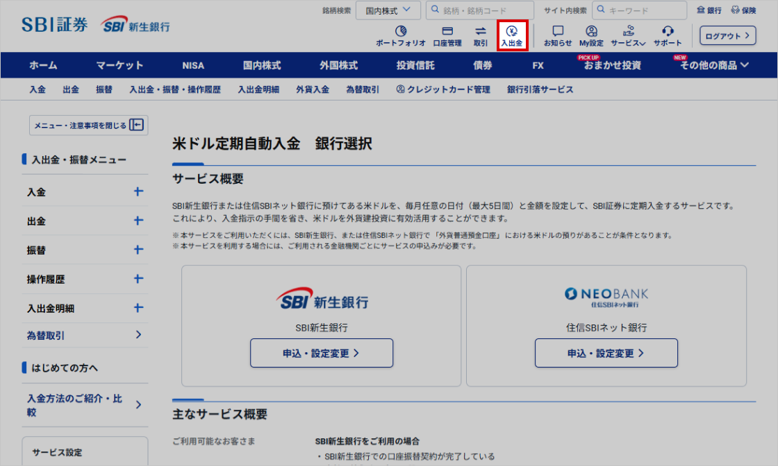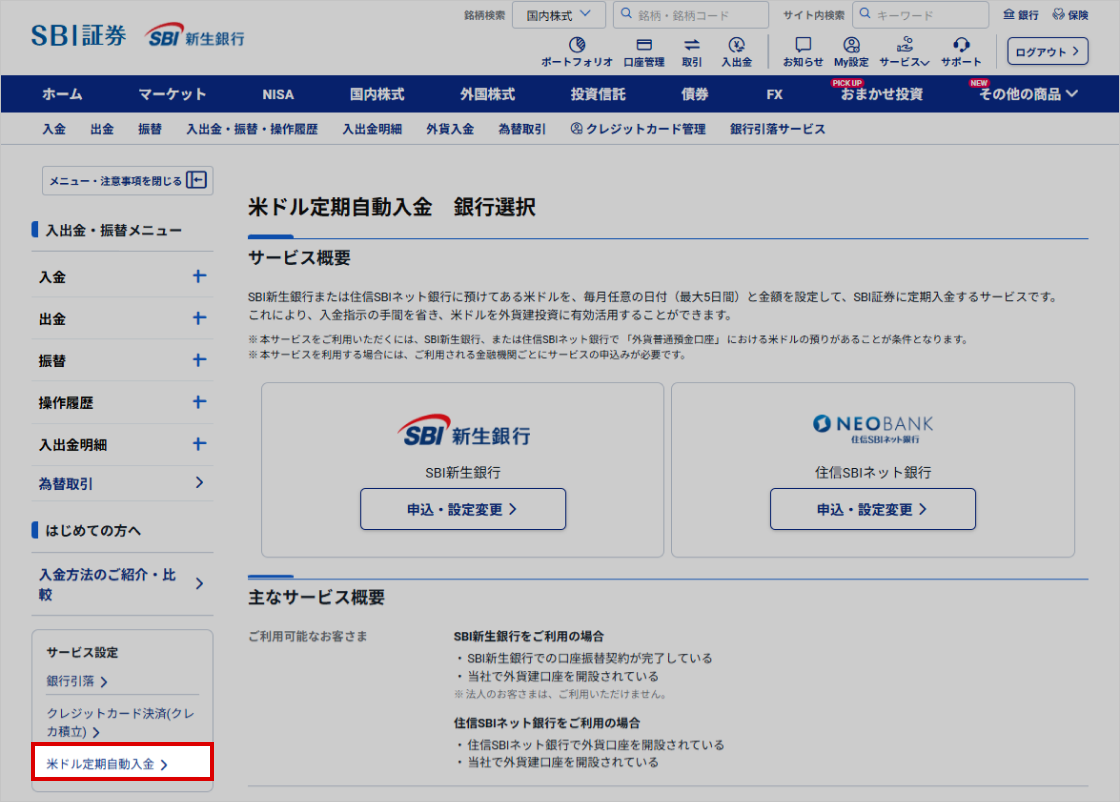 - 米ドル定期自動入金サービス(以下「本サービス」といいます)をご利用いただくためには、「SBI証券の外貨建口座」「利用可能金融機関の外貨普通預金口座」が必要となります。なお、SBI新生銀行をご利用の場合は、口座振替契約の申込が必要となります。