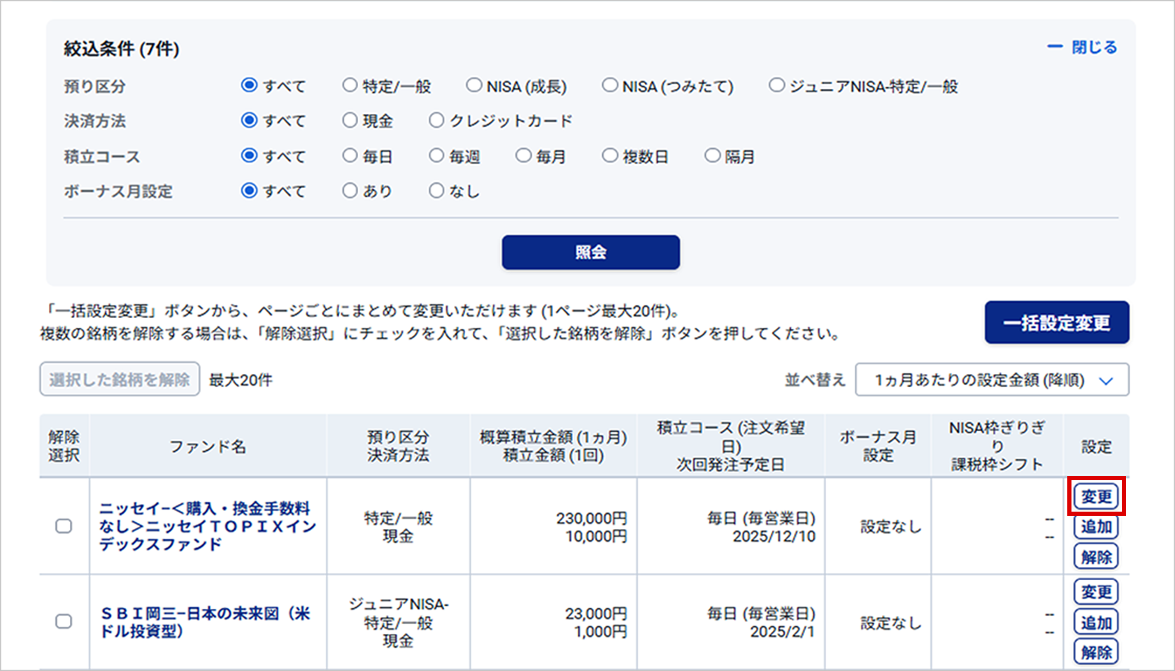 - 1. 「積立設定一覧」画面で、対象のファンドの「変更」ボタンをクリックする