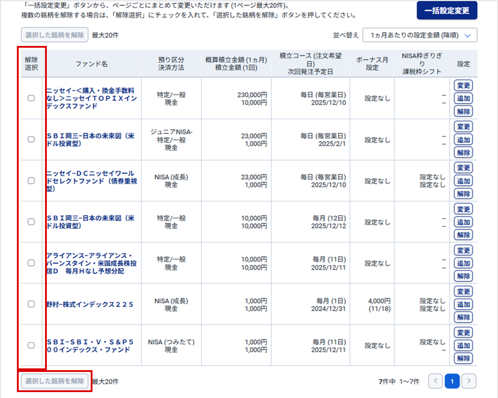 - 1. 「積立設定一覧」画面で、対象のファンドの「解除選択」にチェックを入れ、「選択した銘柄を解除」ボタンをクリックする
