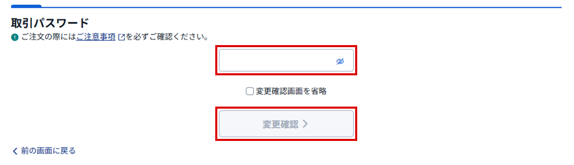 - 3. 取引パスワードを入力し、「変更確認」ボタンをクリックする