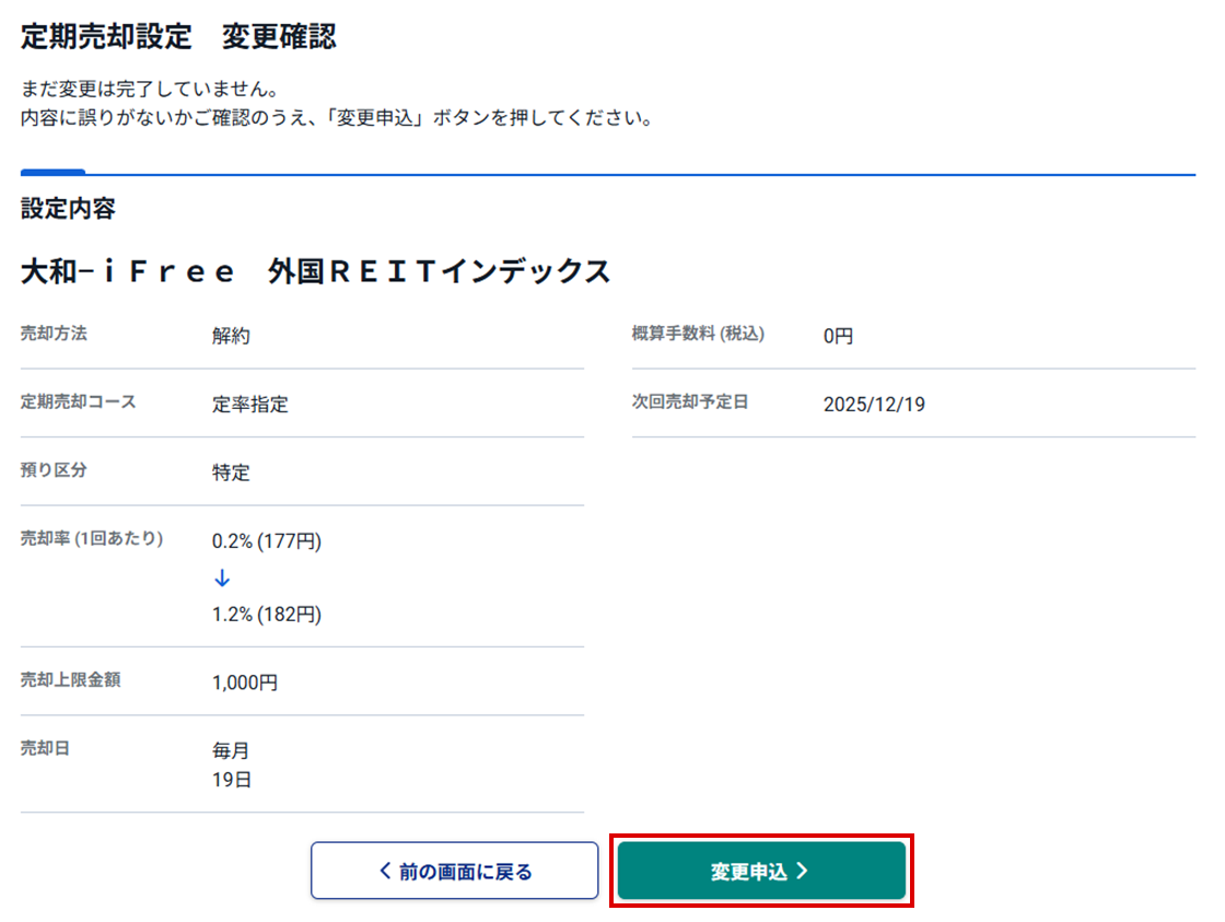 変更申込ボタンを押下すると、完了画面が表示され、定期売却設定の変更が完了します。