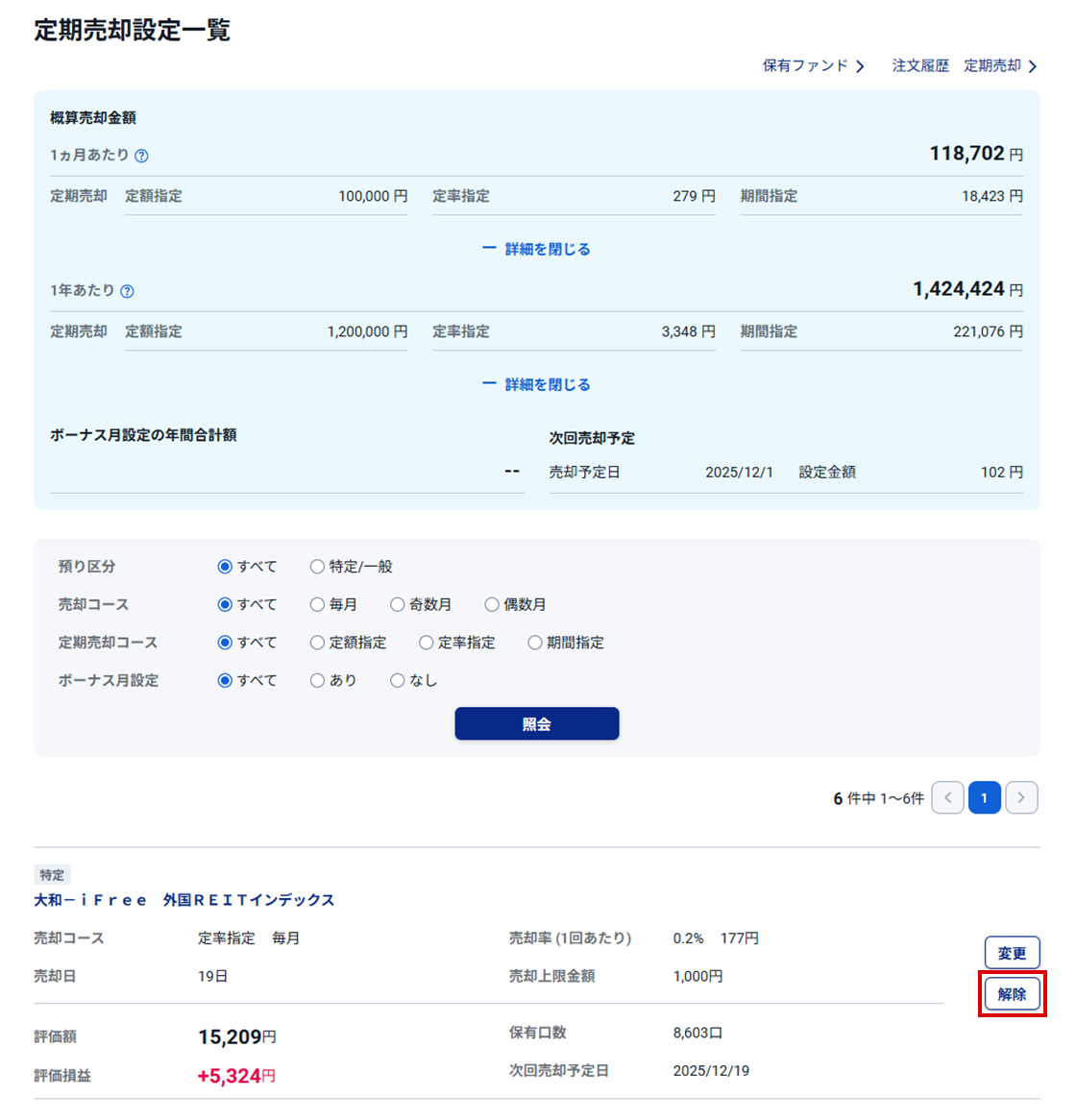 - 1. 「定期売却設定一覧」画面で、対象のファンドの「解除」ボタンをクリックする
