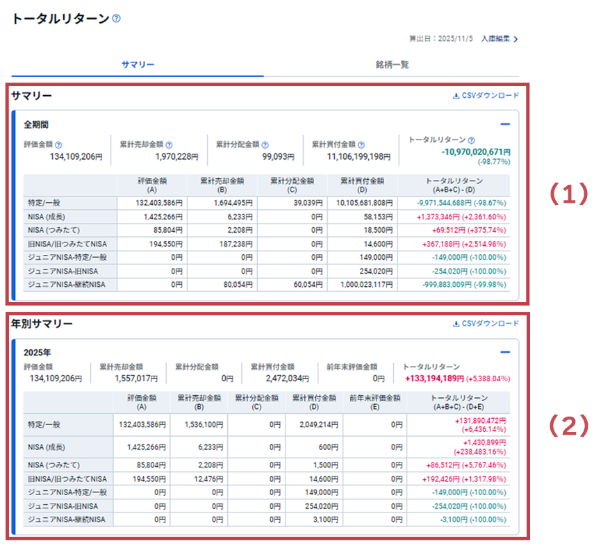 番号 項目 説明 (1) サマリー 2009年11月30日以降の全期間で算出します。預り区分ごとの内訳も表示されます。 (2) 年別サマリー 年ごとのサマリーを表示します。預り区分ごとの内訳も表示されます。 - 2-3. 「銘柄一覧」の見かた