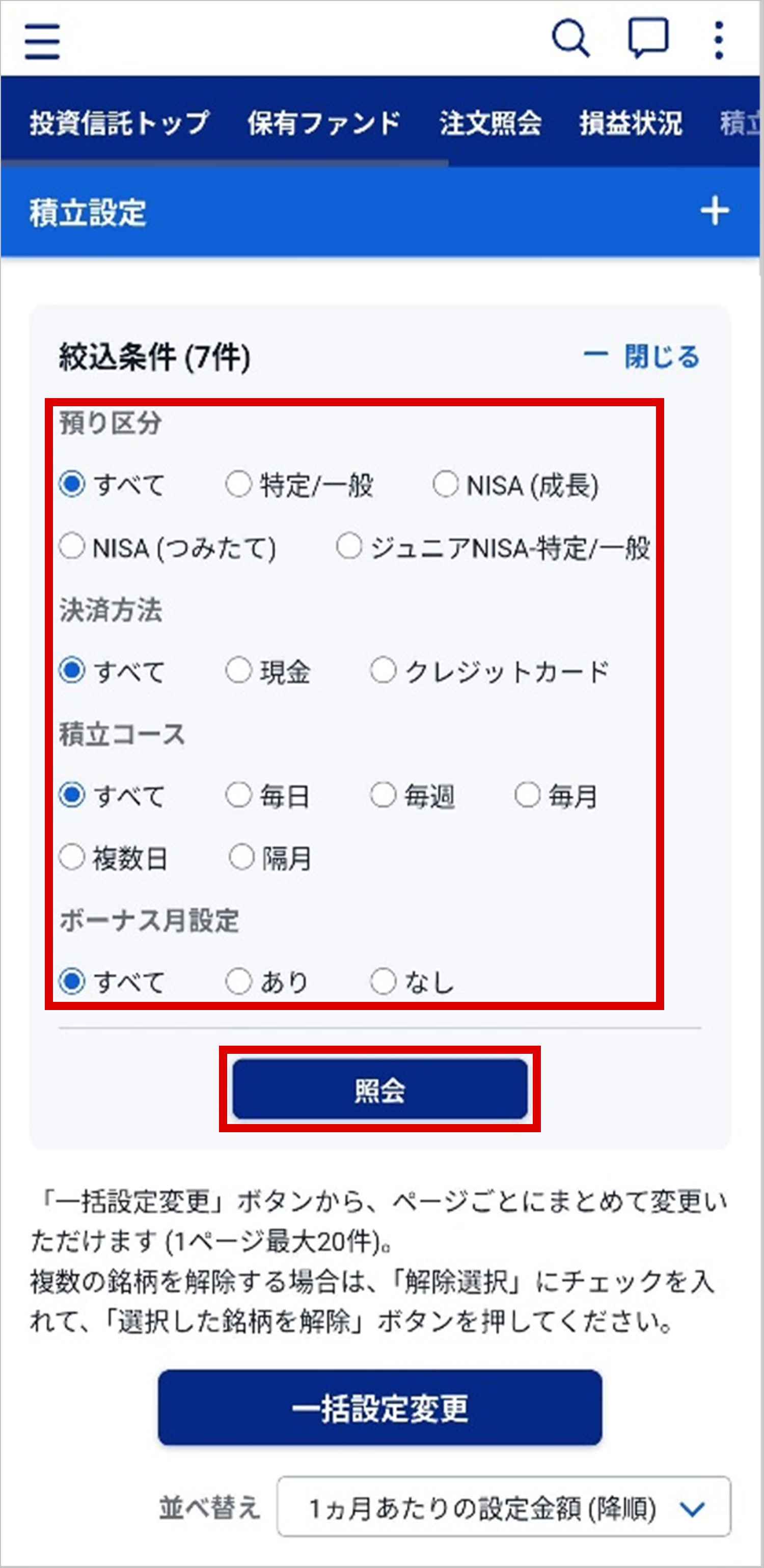 積立設定しているファンドが、検索条件で絞り込まれます。
