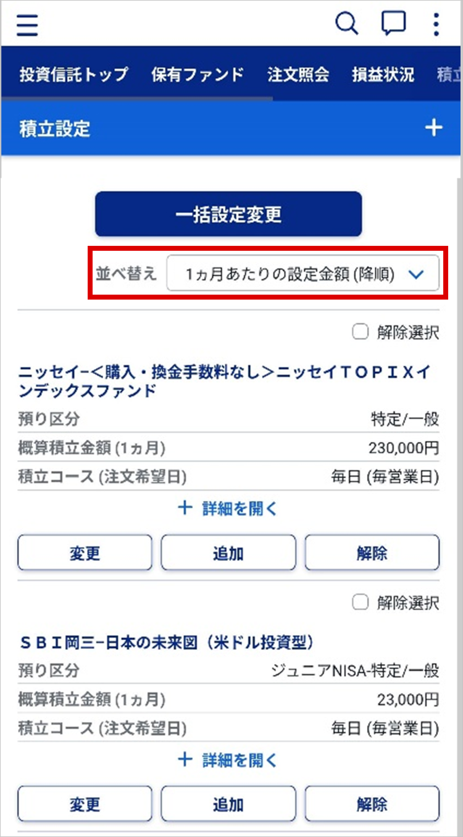 選択した基準に従って、積立設定一覧の表示順が変わります。