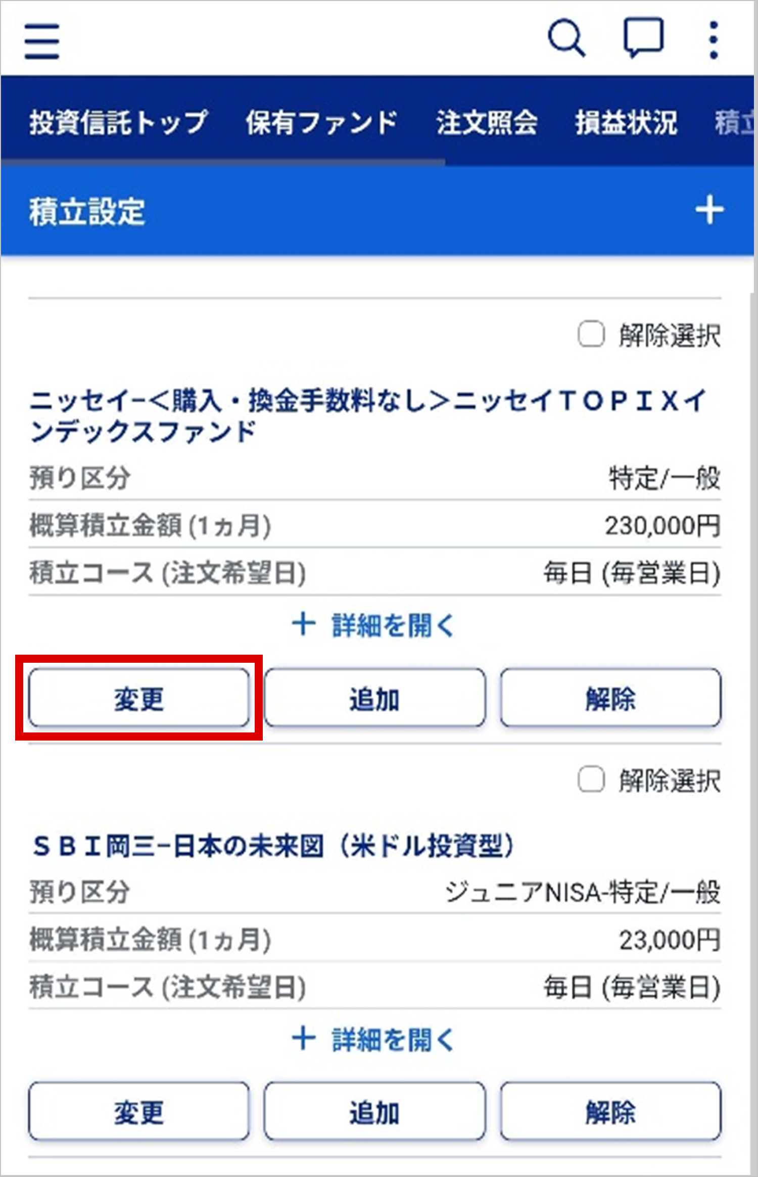 - 1. 「積立設定一覧」画面で、対象のファンドの「変更」ボタンをタップする