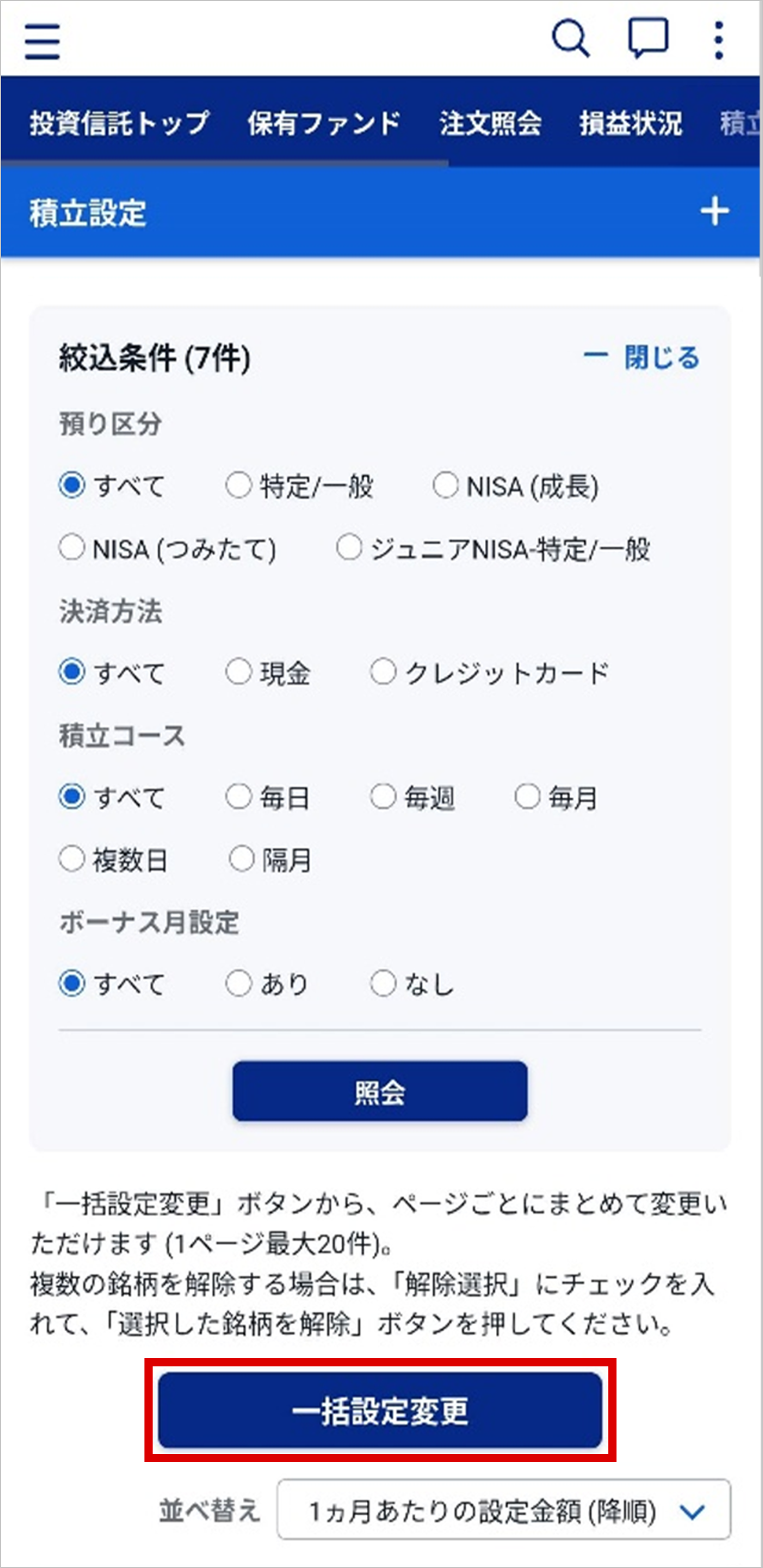 積立設定しているファンドの、積立設定の内容を一括で変更します。「一括設定変更」から変更ができるのは、「積立コース」「注文希望日」「設定金額」です。