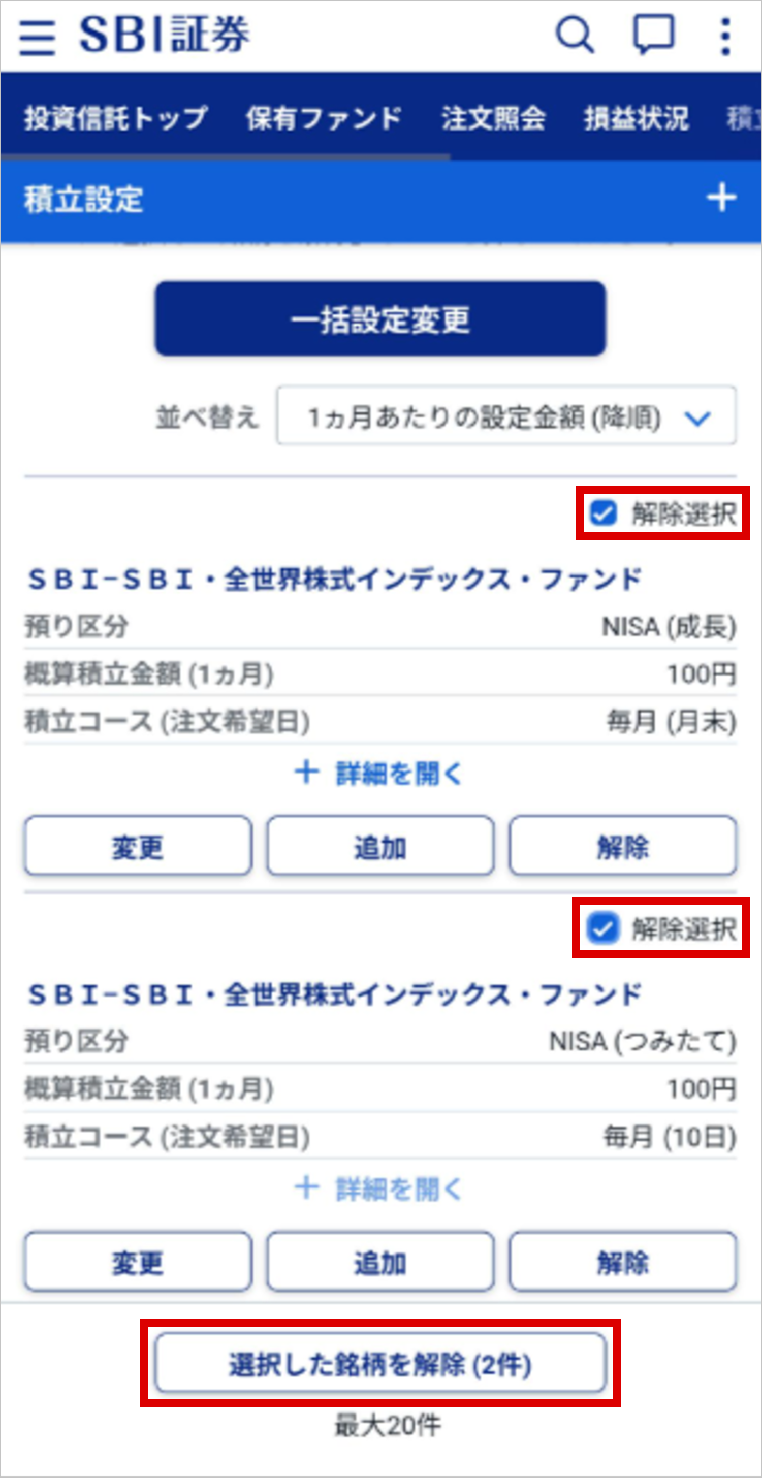 - 1. 「積立設定一覧」画面で、対象のファンドの「解除選択」にチェックを入れ、「選択した銘柄を解除」ボタンをタップする