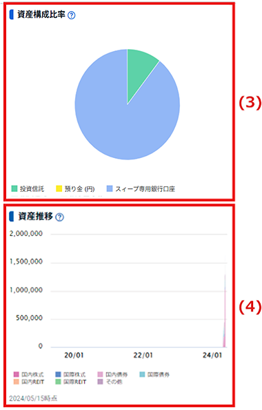 (3) | 資産構成比率 | 保有するファンドの評価額、預り金、スィープ専用銀行口座残高の比率が円グラフで表示されます。 |