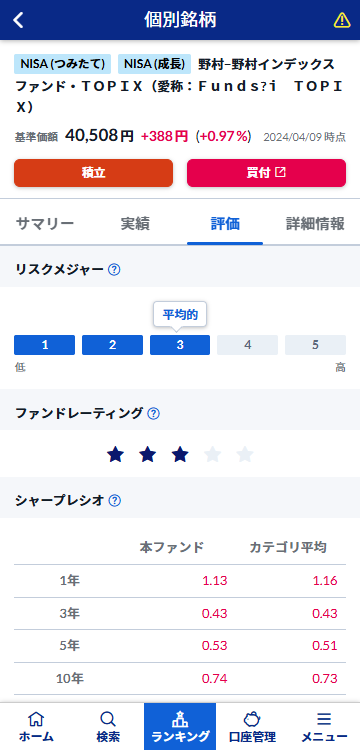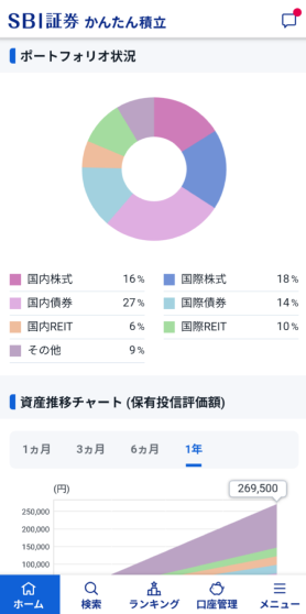 ログイン後に表示される「ホーム」画面では、保有ファンドの評価損益や評価額の推移をひと目で確認できます。
