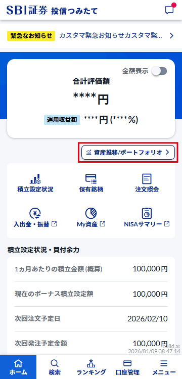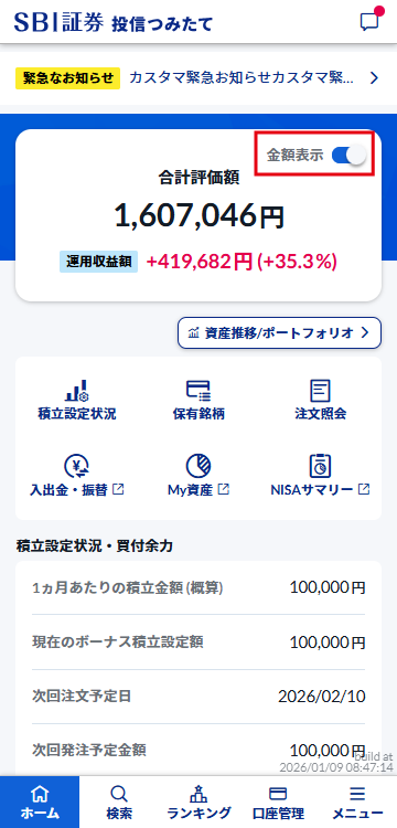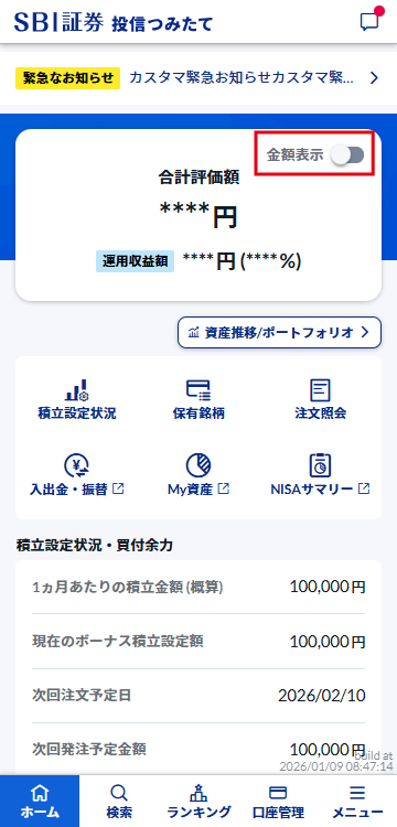 「金額表示」がオフの場合は「合計評価額」と「運用収益額」の金額が非表示になります。金額を表示するには、「金額表示」をオンにしてください。