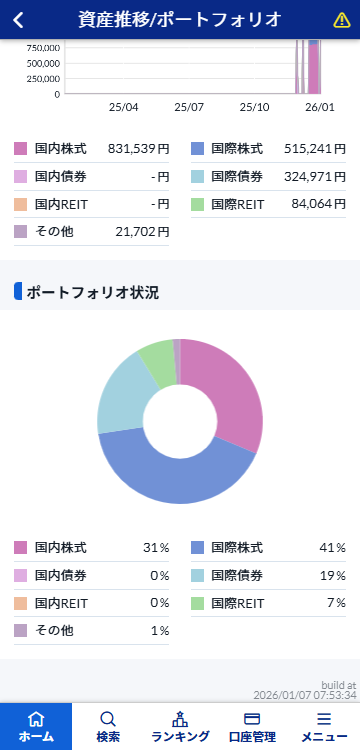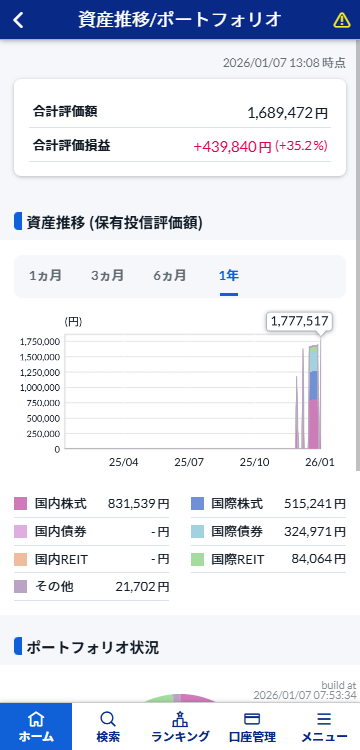 「資産推移/ポートフォリオ」ボタンをタップすると、「資産推移(保有投信評価額)」と「ポートフォリオ状況」が表示されます。