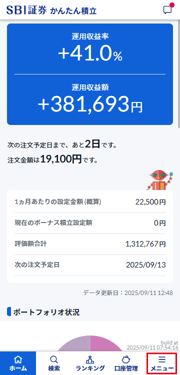 SBI証券 かんたん積立 アプリにログインしてみましょう。
