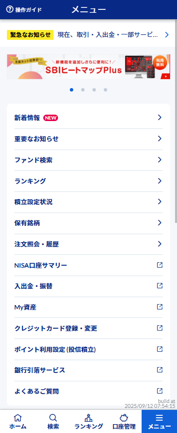メニューから、SBI証券 かんたん積立 アプリの各機能を利用できます。