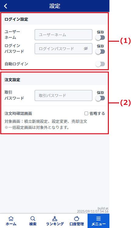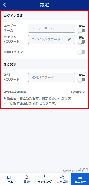 「取引パスワード」の右側の「保存」をオンにし、取引パスワードを入力すると、積立設定時や売却注文時などに取引パスワードの入力を省略できます。