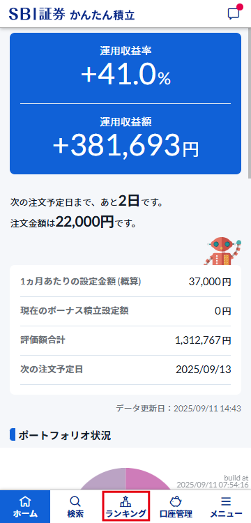 月間ランキングは、月初1日から月末最終日までの積立設定データをもとに、翌月1日の朝方に更新されます。