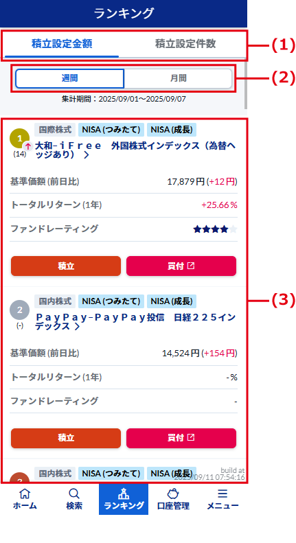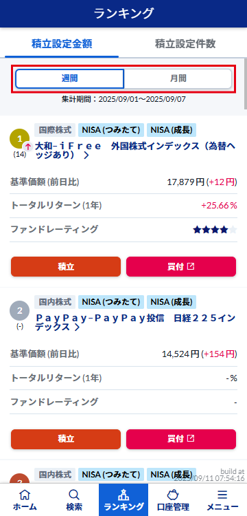 ファンドランキングの集計期間を「週間」または「月間」に切り替えられます。