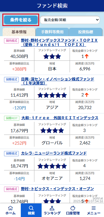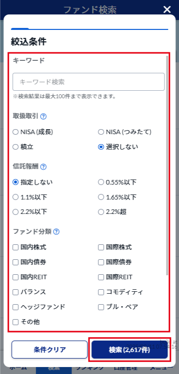 ファンド名などのキーワード、買付手数料、NISAの対象かどうか、信託報酬、ファンド分類などからファンドを検索し、詳細情報を表示できます。